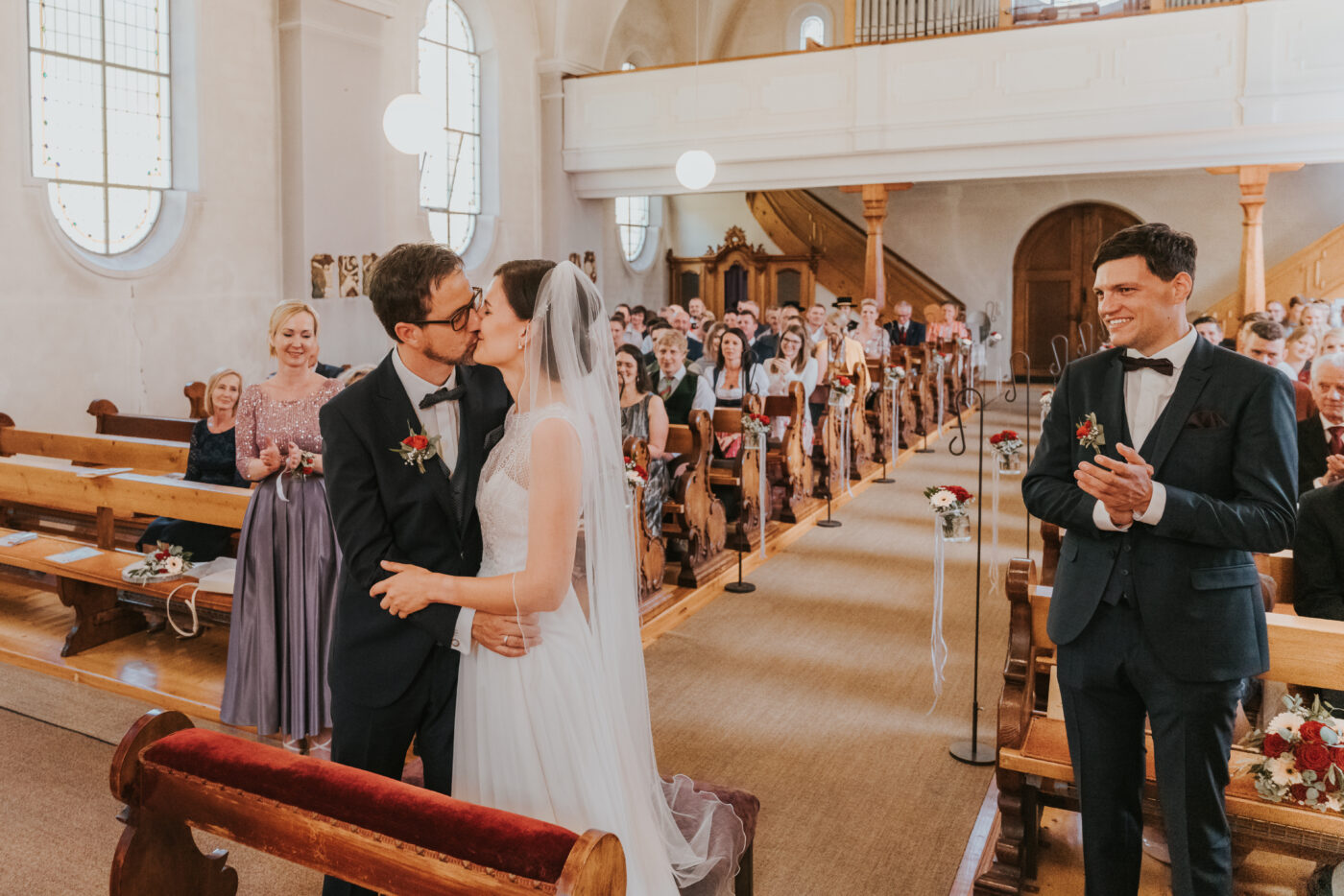 Nach der Trauung folgte dann die Agape. Bei der Agape hatten die ganzen Gäste genügen Zeit, dem Brautpaar ihre Glückwünsche auszusprechen. Die vielen Umarmungen durften dabei natürlich nicht fehlen. Bei der Agape sind wir mit unserer Kamera natürlich auch immer in der Nähe und fangen die ganzen emotionalen Momente ein. Die Bilder der Agape sind auch immer besonders toll, wenn man später die Hochzeitsbilder durchschaut und dann an den Tag zurückerinnert wird. So sieht man immer nochmals, wer an diesem besonderen Tag mit dabei war.